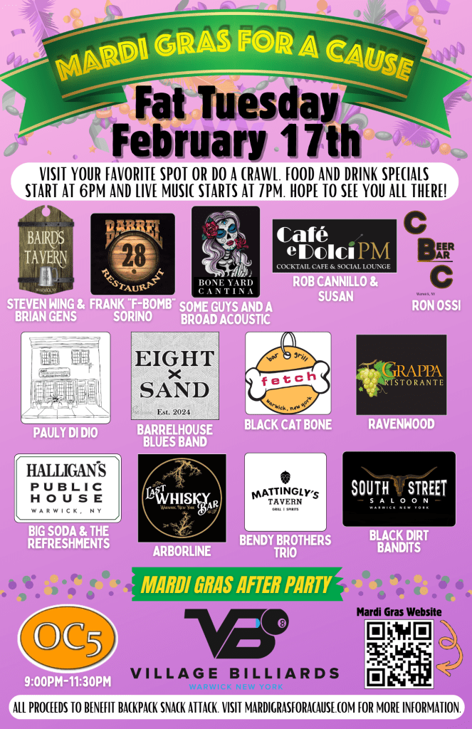SAVE THE DATE! Our 14th Annual Mardi Gras for a Cause to benefit Backpack Snack Attack will be held on Fat Tuesday, February 17th!