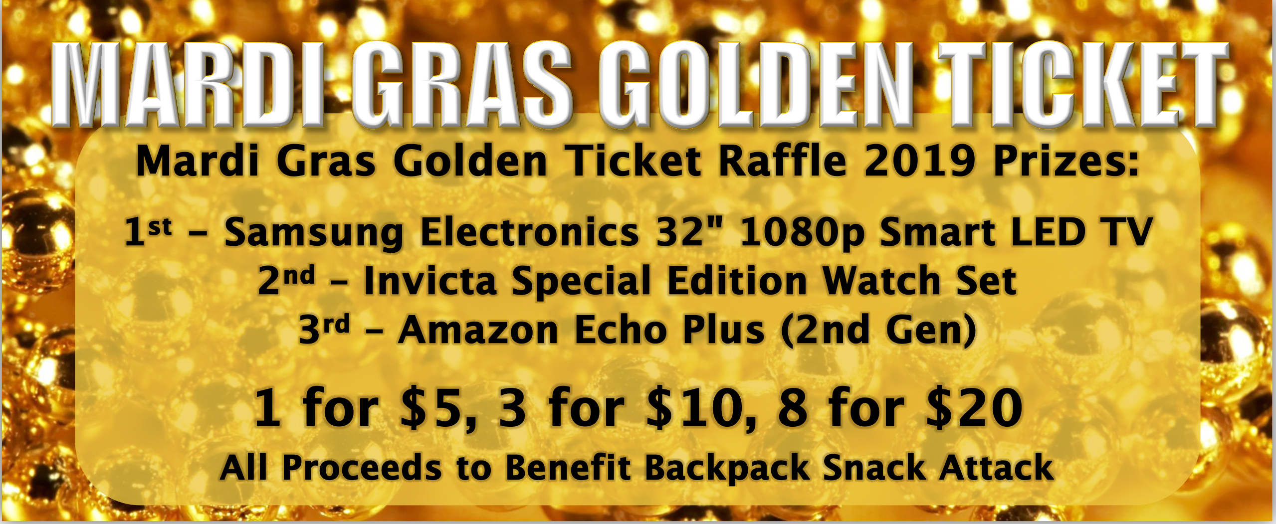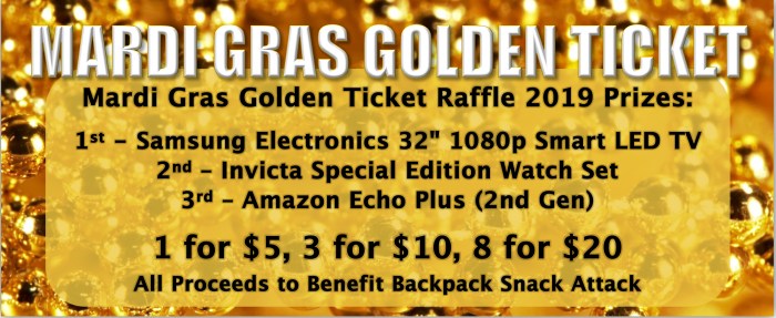 This year the Mardi Gras Golden Ticket will be available in advance from a Mardi Gras for a Cause Committee member. You may also purchase golden tickets the night of the event at each of the participating locations. The prizes are as follows:The Mardi Gras Golden Raffle Tickets can be purchased one for five dollars, three for ten dollars, or eight for twenty dollars, with 100% of proceeds to go to Backpack Snack Attack. The winning tickets will be drawn at 11:45pm on Tuesday, March 5th, 2019 at The Warwick Inn. Those selected need not be present to win. In the event that winners are not present at the time of the drawing, they will be notified by phone or email on Wednesday, March 6th 2019. Best of luck and thanks for your support!