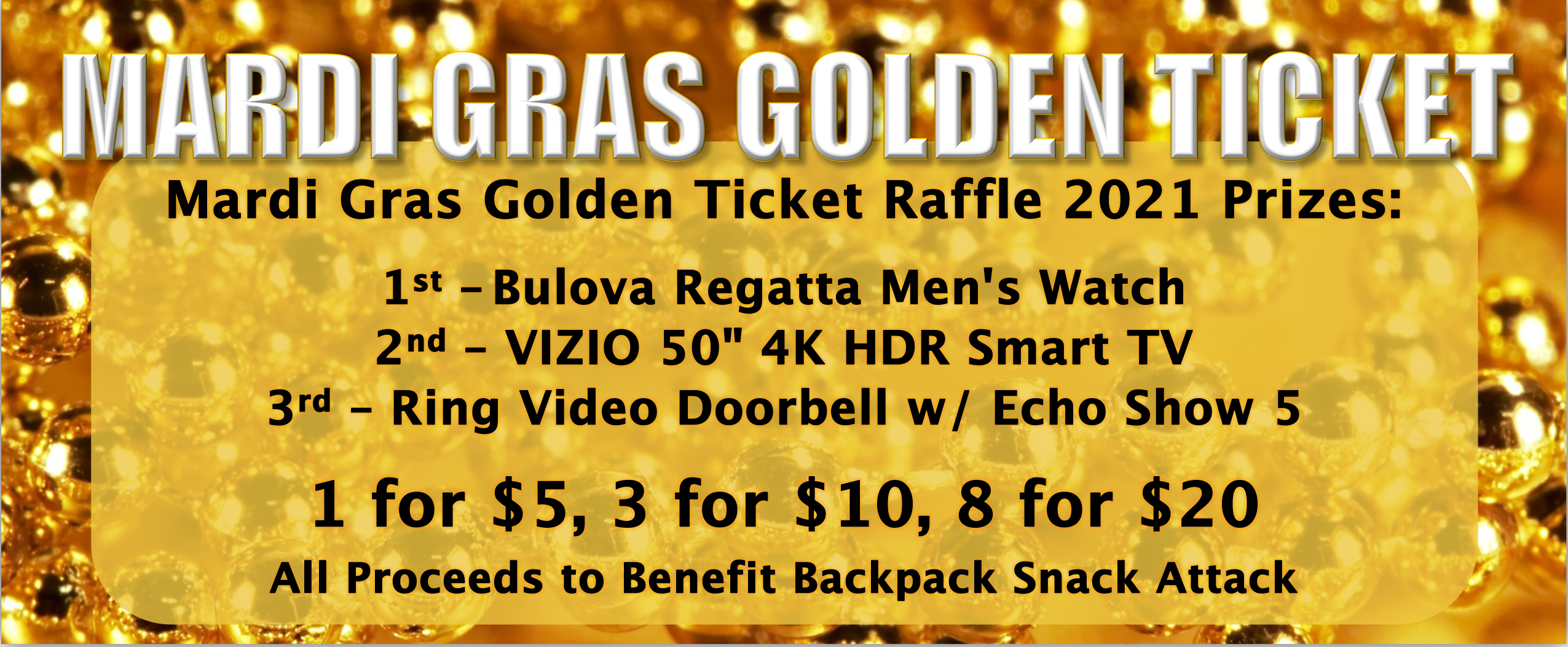 The Mardi Gras Golden Raffle Tickets can be purchased one for five dollars, three for ten dollars, or eight for twenty dollars, with 100% of proceeds to going to Backpack Snack Attack. The winning tickets will be drawn on Sunday, June 13th, 2021 at Blue Arrow Farm. Those selected need not be present to win. In the event that winners are not present at the time of the drawing, they will be notified by phone or email following the event. Best of luck and thanks for your support!