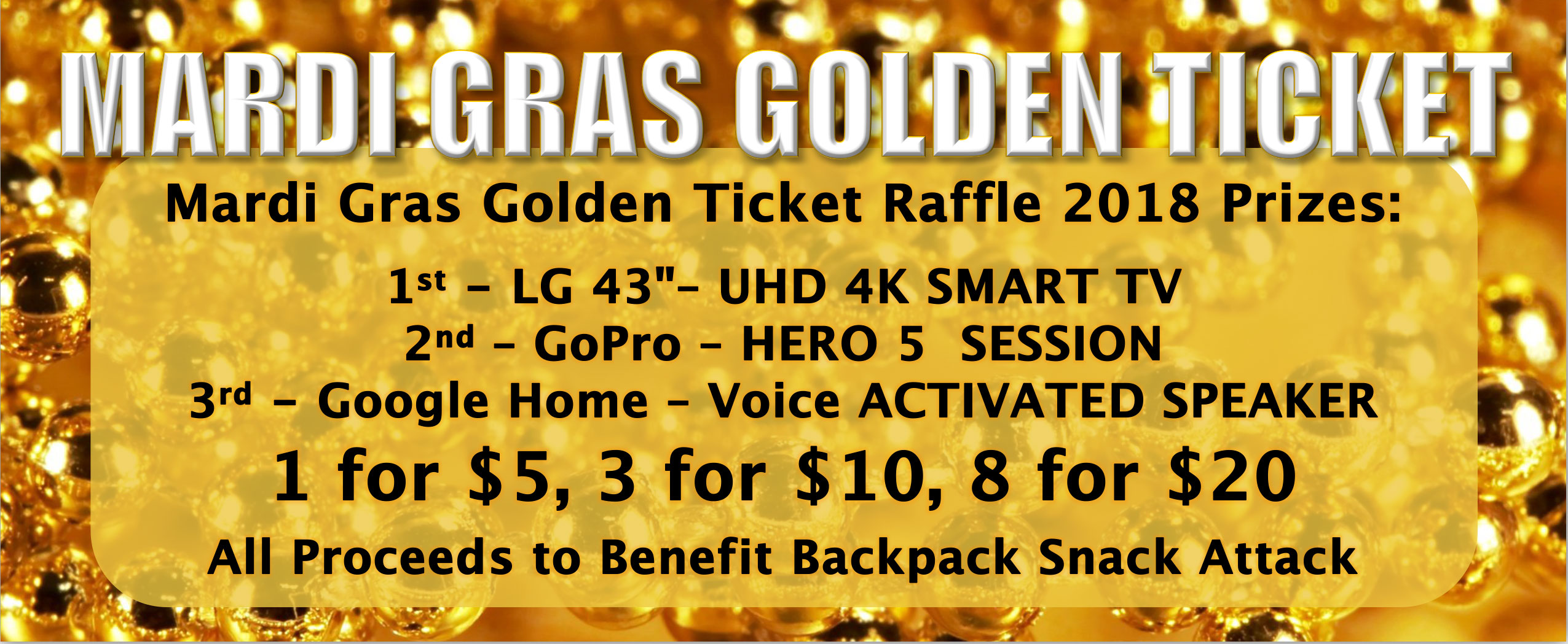 This year the Mardi Gras Golden Ticket will be available in advance from a Mardi Gras for a Cause Committee member or at each of the participating locations. You may also purchase gold tickets the night of the event at each of the participating locations. The prizes are as follows:The Mardi Gras Golden Raffle Tickets can be purchased one for five dollars, three for ten dollars, or eight for twenty dollars, with 100% of proceeds to go to Backpack Snack Attack. The winning tickets will be drawn at 12:15am on Wednesday, February 14th, 2018 at Village Billiards, and those selected need not be present to win. In the event that winners are not present at the time of the drawing, they will be notified by either phone or email by Wednesday, February 14th 2018. Best of luck and thanks for your support!